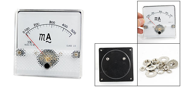 Product Name Analog Ammeter Model YS-80 Measuring Current Range AC 0-500mA Accuracy Class 2.5 Meter Face Size(Approx.) 8.2 x 8.2 x 1.3cm / 3.2" x 3.2" x 0.5" (L*W*H) Thread Size 0.2 x 1cm / 0.08" x 0.39" (D*L) 0.4 x 1.4cm / 0.16" x 0.55" (D*L) Total Thickness 5cm / 2" Material Plastic, Electronic Components Color White, Black Net Weight 118g Package Content 1 x Analog Ammeter Installation kits - Reviews