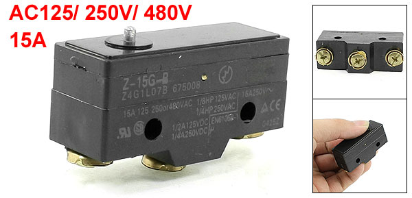 Product Name Limit Switch Model No. Z-15G-B Terminal Style 3 Screw Terminal Actuator Type Long Straight Hinge Lever , Automatic Reset Rating & Voltage AC125/ 250V/ 480V, 15A Power 1/8HP/ AC125V, 1/4HP/ AC250V Roller Dia. 12.5 x 4.5mm/ 0.5" x 0.14"(D*T) Fixing Holes Dia. 0.4cm / 0.16“ Hole Center Point Distance 2.5cm / 0.98" Switch Body Size 5 x 1.8 x 2.8cm / 1.97 x 0.7 x 1.1"(L*W*H) Body Main Color Black Net Weight 22g Package Content 1 x Limit Switch - Reviews