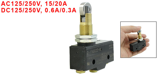 Product Name Limit Switch Model No. Z-15GQ22-B Mounting Type Panel Mount Contact Configuration 1NO,1NC(SPDT) Terminals Screw Terminal Actuator Type Parallel Roller Plunger Rating & Voltage AC125/250V, 15/20A DC125/250V, 0.6A/0.3A Switch Body Size ~5 x 1.8 x 2.7cm / 1.97 x 0.7 x 1.1"(L*W*H) Fixing Holes Dia. ~0.4cm / 0.16“ Distance Between Centers of Fixing Holes ~2.5cm / 0.98" Roller Actuator Size Height from Body (open): ~3.4cm / 1.34” Height from body (closed): ~2.8cm / 1.1" Thread: ~1.2 x 1.6cm / 0.47 x 0.63" (D*H) Color Black & Gold Tone Net Weight 55g Package Content 1 x Limit Switch - Reviews