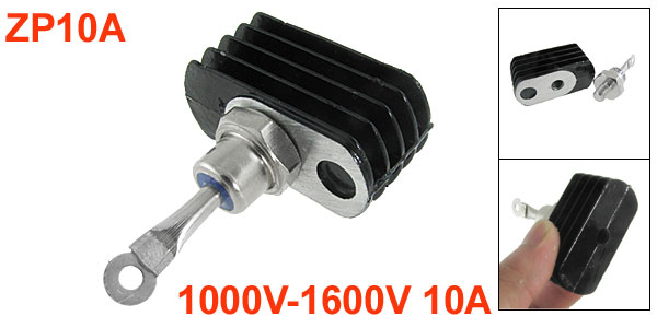 Product Name Rectifier Diode Model No. ZP10A Average Forward Current 10A Repetitive Peak Reverse Voltage(VRRM) 1000V-1600V Heatsink Size 51 x 24 x 24mm / 2.0" x 0.9" x 0.9"(L*W*H) Stud Hole Diameter 4mm / 0.16" Hex Head Diameter 20.5mm / 0.81" Stud Hole to Hex Head Length 39mm / 1.5" Overall Height 68mm / 2.7" Material Metal, Ceramic, Aluminum Weight 40g Package Content 1 x Rectifier Diode - Reviews