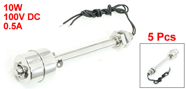 Product Name Floating Switch Model No. ZS12010 Max Contact Rating 10W Max Switching Voltage 100V DC Max Switching Current 0.5A Max Breakdown Voltage 220V DC Max Carry Current 1A Max Contact Resistance 100mΩ Max Temperature -30°C - +120°C Material Stainless Steel, SUS304 Thread Dia(Approx) 10mm / 0.39" Thread Length 15mm / 0.59" Switch Total Length 120mm / 4.7" Cable Length 34cm / 13.4" Color Silver Tone Net Weight 246g Package Content 5 x Floating Switch - Reviews